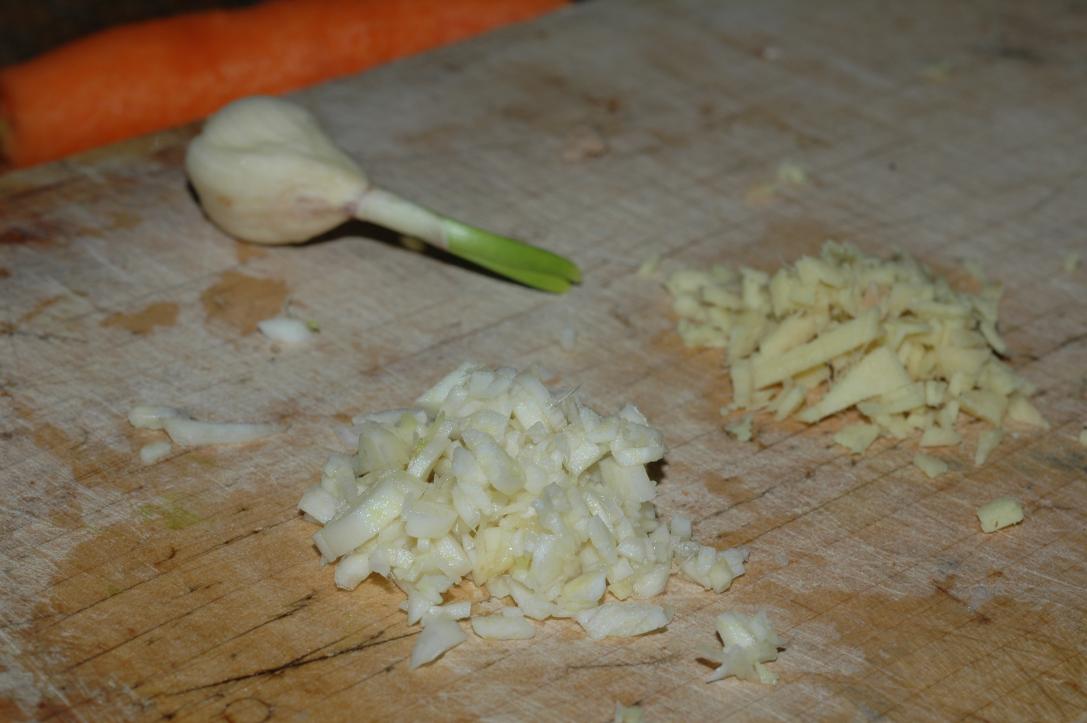 garlic and ginger, preparation for the wok; the spots on the cutting boards do distract, though