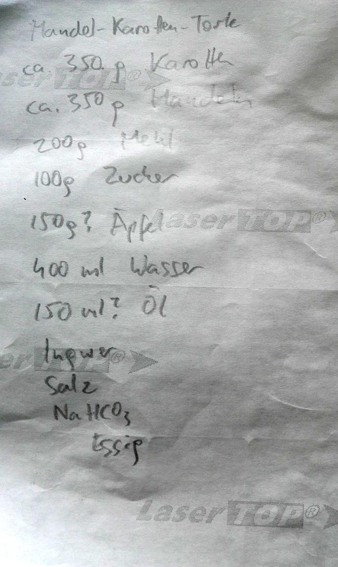 Mandel-Karotten-Torte vegan/ca. 350 g Karotten/ca. 350 g Mandeln/200 g Mehl/100 g Zucker/ca. 150 g Äpfel/ca. 400 ml Wasser/ca. 150 ml Olivenöl/Ingwer/Salz/Natriumbicarbonat (Speisesoda)/Essig/ca. 1 h bei 160 ° C Umluft backen (180 ° C Ober- und Unterhitze), Nadelprobe